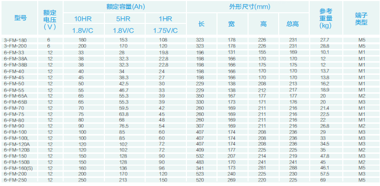 在20℃環境下,FM系列小型密封電池浮充壽命可達3~5年,FM固定型密封電池浮充壽命可達8~10年,FML系列電池浮充壽命可達10年,FMH系列電池浮充壽命可達10年,GFM系列、太陽能深循環系列電池浮充壽命可達15年,GFMJ系列電池浮充壽命可達18年。